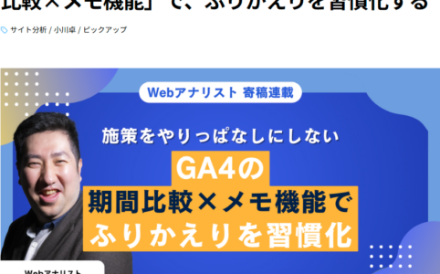 施策やりっぱなしになってない?GA4の「期間比較×メモ機能」で、ふりかえりを習慣化する 今回は、GA4の「期間比較」と「メモ機能」を活用し、効果検証を習慣化する方法を紹介します。 媒体紹介 オウンドメ...
