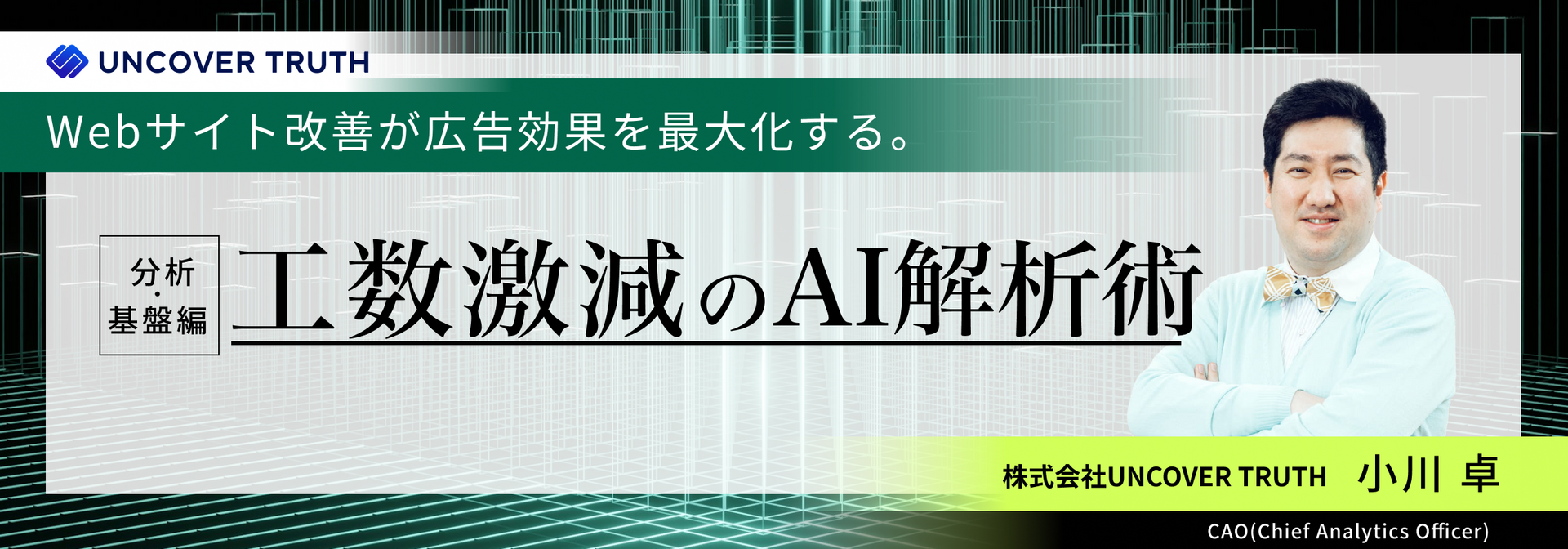 小川は、「工数激減のAI解析術」と題し、AIを活用した最先端のWebサイト分析で、その課題を解決する方法をご紹介します。