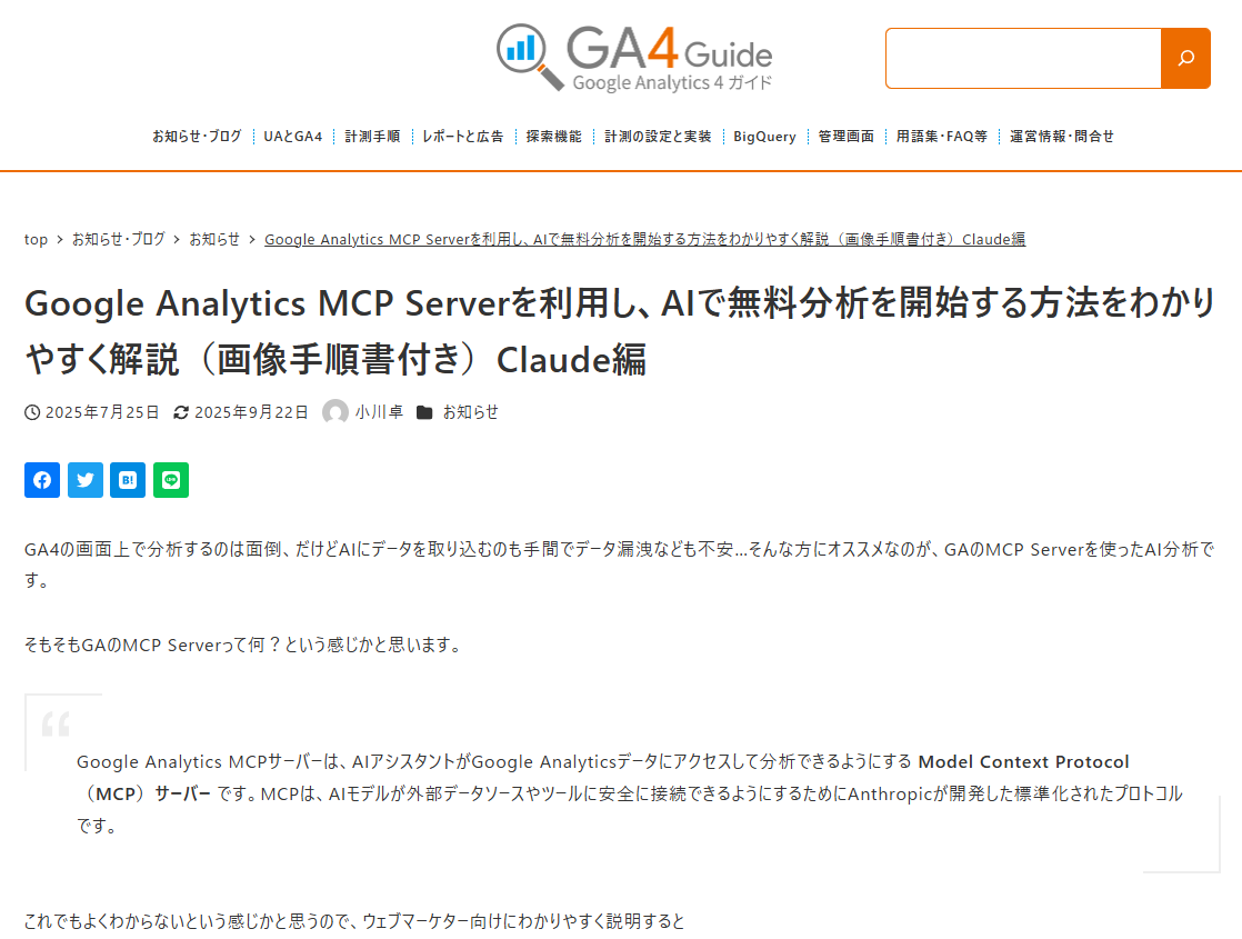 GA4ガイド内の記事「Google Analytics MCP Serverを利用し、AIで無料分析を開始する方法をわかりやすく解説(画像手順書付き)Claude編」を最新版に更新しました。