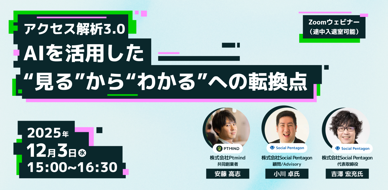 Google Analytics(GA4)の登場以降、多くのマーケターが「データはあるのに、次に何をすべきかわからない」という壁に直面しています。アクセス解析は、もはや“データを読む”仕事ではなく、“意味を見抜く”仕事へと変わり始めています。本セミナーでは、ウェブ解析の第一人者・小川卓氏と、AIヒートマップの開発を手がけるPtengineがタッグを組み、「AIが解析をどこまで担えるのか」「人とAIがどう協働して顧客理解を深めるのか」を実例を交えて徹底解説します。